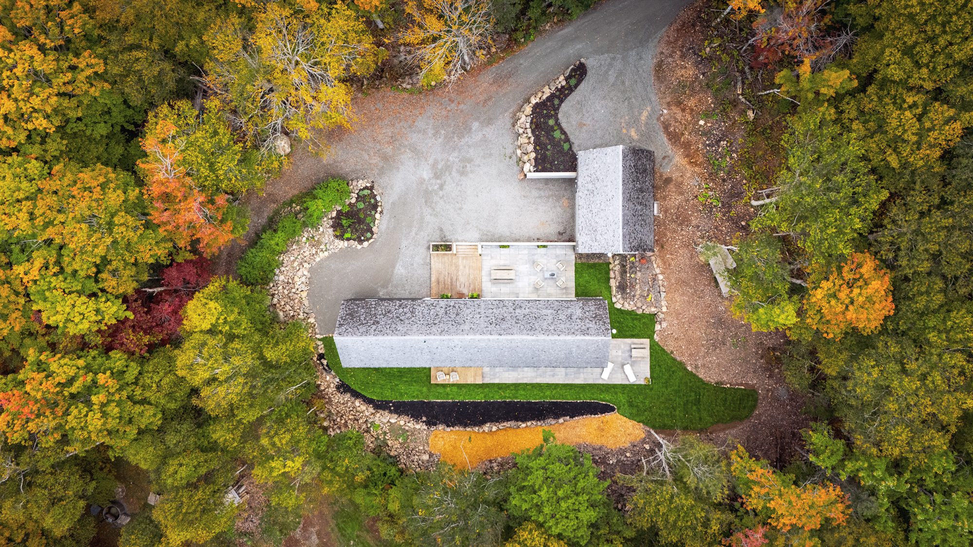 The topographies’ unique challenges led to a site-ledstrategy: a landscape game descending off the road towards the water in asequence while maximizing views. The main house sits parallel to the contoursand shoreline and maintains a prospect along the length of the house. Thesecondary unit acts as a threshold – the first point of arrival- and is rotatedperpendicular to the main house to mediate the quick change in grade whileallowing ground level access to both the guest suite and the garage below